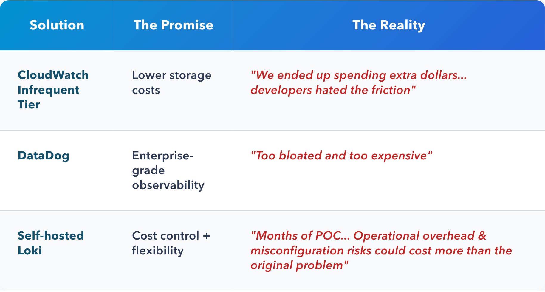 - CloudWatch Logs' expensive ingestion pricing started catching on. They tried infrequent tier only to significantly worsen their productivity