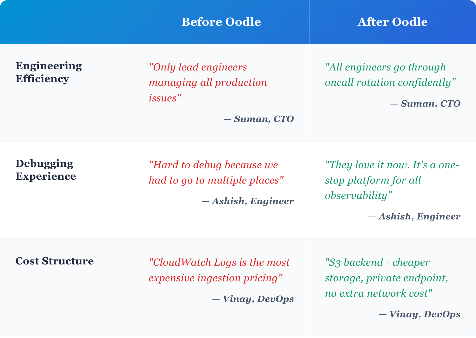 The results exceeded expectations. Rather than friction and learning curves, engineers found Oodle intuitive. No training required—it was "plug and play." The UI made all the difference. Where CloudWatch demanded query language expertise, Oodle offered intuitive filters that any engineer could master immediately.