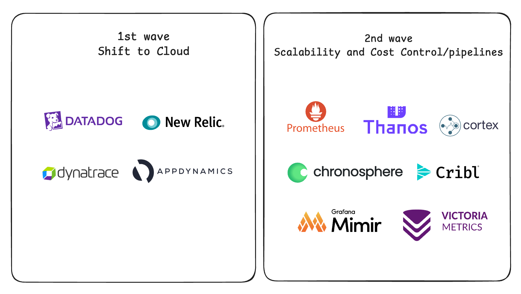 The diagram above shows the evolution of observability products. The first wave solved the observability pain points for out-of-the-box experience. Scalability, and data volume problems started to emerge. Second wave tried to tackle scale problem head-on and are handling data volume challenges partially. There is more innovation happening, but for the most part, organizations are still struggling with cost and debugging speed challenges.