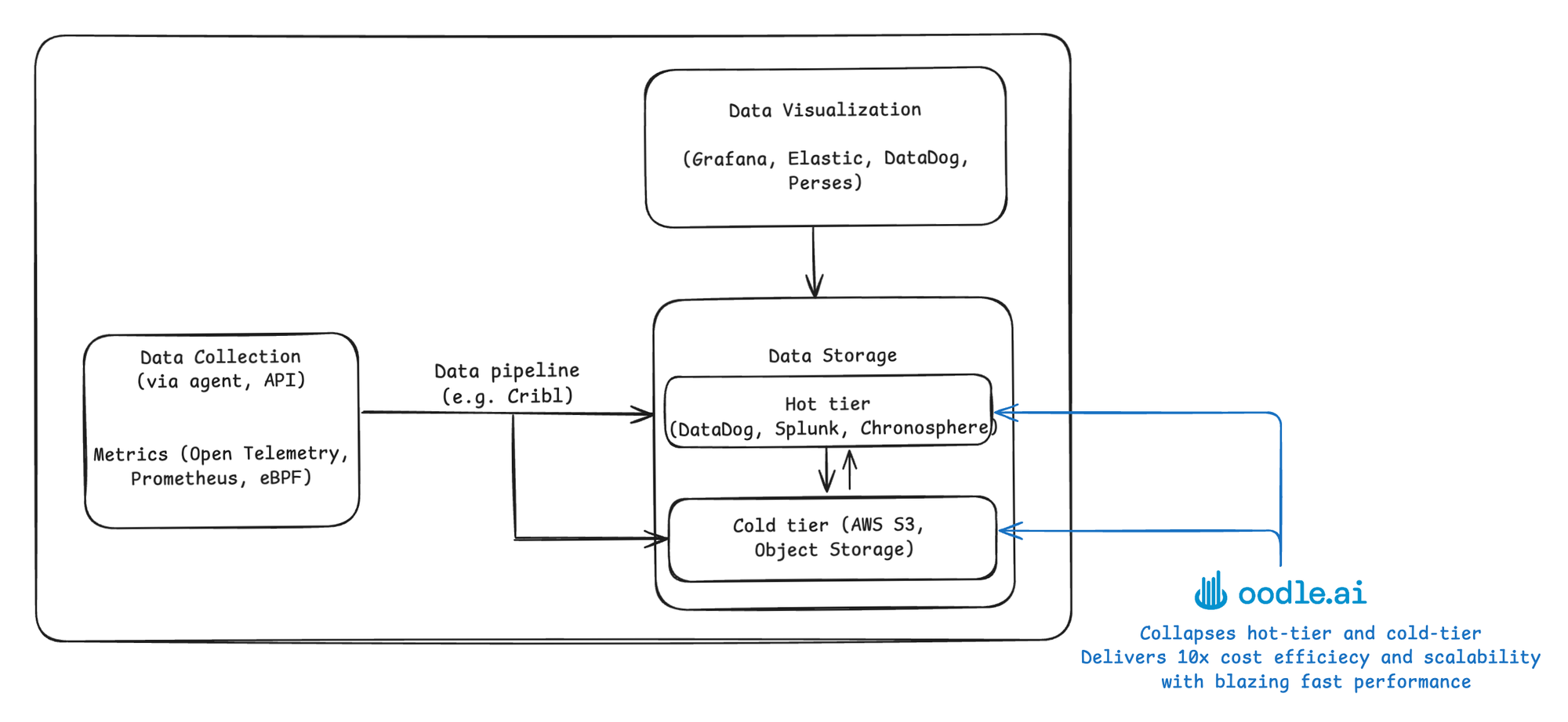 Oodle eliminates hot/cold tiering, collapsing everything into a single, efficient layer. Unlike traditional systems with 3-way SSD replication or legacy architectures, Oodle emphasizes operational simplicity and easy migration.