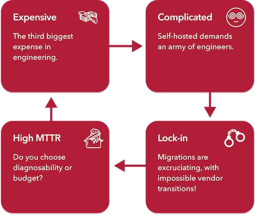 Yet, despite all these efforts, we were left stranded with none of them addressing the needs around cost, scale and debugging speed over these five years. They kept on appearing in different forms over the years. We heard more and more of these comments from 50+ observability leaders in the industry, further validating that it's a widespread problem.